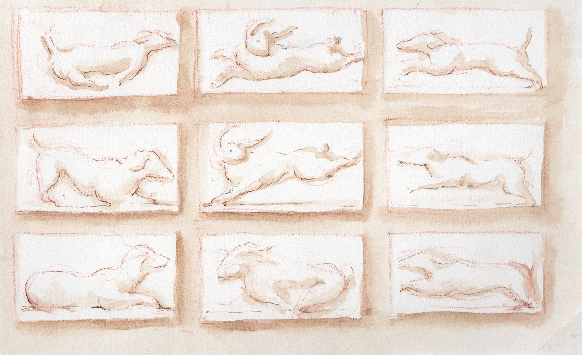 The reliefs depict the family dachshund lying on his belly after chasing a rabbit. Tulis designed the scene to follow the movement of the sun: at sun rise, the view highlights the dog in motion; the sun settles on the dog at rest.